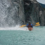 Kommandos auszutauschen. Ich bin froh, schon ein wenig Kajakerfahrung zu haben, da es etwas Geschick gebraucht, das Boot durch das Eis zu manövrieren. Zunächst ist es etwas unheimlich an den