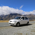 Jeff hat mir in Christchurch geholfen, ein Auto zu mieten. Mit dem kleinen, weißen Flitzer werde ich die nächsten Wochen die Südinsel erkunden. Nach Langem sitze ich wieder am Steuer. Ui,