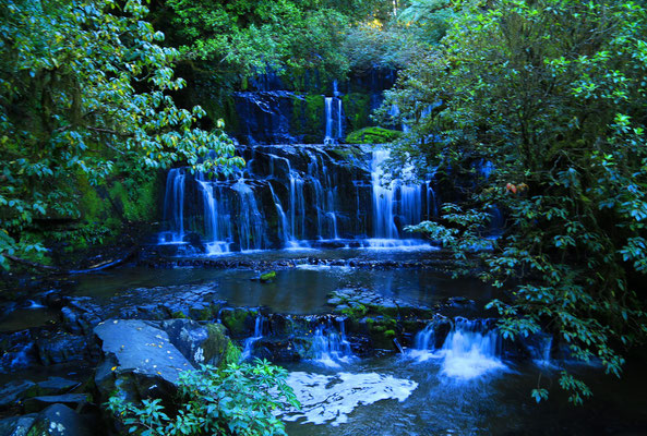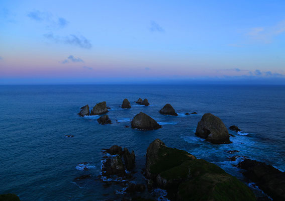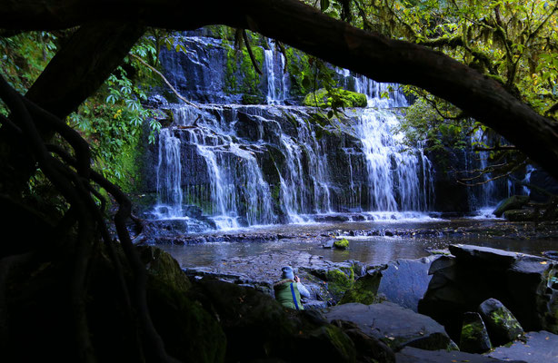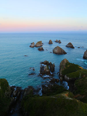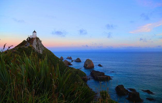 Nachdem alles Gepäck verstaut wurde, starten wir in Richtung Catlins. Alle sind gut drauf, es verspricht ein schöner Tag zu werden und ich bin überglücklich, während der Autofahrt Unterhaltung zu haben. Es war genau die richtige Entscheidung, die abgelegene Gegend Neuseelands zu besuchen. Nicht viele Touristen kommen hier vorbei, jedoch am Meer entlang gibt es eine Sehenswürdigkeit nach der anderen und man ist praktisch überall alleine. Herrlich! Die endlosen, breiten Strände, Monkey Island, der südlichste Punkt der Insel, unendlich viele Wasserfälle im angrenzenden Regenwald und der Sonnenenuntergang am Leuchtturm beim Nugget Point. Leider waren wir zu spät dran, um die Cathedral Caves zu besichtigen. Die Höhlen sind nur bei Ebbe vom Strand aus zu besichtigen. Nach eingebrochener Dunkelheit machen wir uns auf den Weg ins Hostel. Mandy spaßte schon die ganze Zeit im Auto, dass wir in dieser verlassenen Gegend wohl auf ein Hostel im Niemandsland treffen werden. Wir rufen uns die besten Szenen sämtlicher Horror-Movies ins Gedächtnis und als das Navi meint: „Sie haben ihr Ziel erreicht“, kann niemand mehr was sagen. Mit gespenstischer Stille schauen wir auf das ehemalige Krankenhaus in verlassener Landschaft. Ah, das also ist unser Hostel. Es sieht wie ausgestorben aus und das ist es auch. Niemand, rein gar niemand ist da! Alle Türen stehen offen und auf einer kleinen Tafel lesen wir: „Welcome – your room is 106“. Die Gänge sind dunkel und die Türen quitschen. Ich werde mir bewusst, dass wir zu viert heute Nacht ganz alleine in einem ehemaligen Krankenhaus übernachten. Schlagartig wird mir auch bewusst, was für ein Glück ich habe. Hätten sich die Mädels mir nicht angeschlossen, wäre ich nun mutterseelen alleine hier. Daran möchte ich lieber nicht denken, kann ich auch nicht, denn plötzlich quitscht eine Türe. Ach du Scheiße! Wir bemerken, dass sich in der Küche ein Typ aufhält. Wie es sich herausstellt, ein Australier, der auf der angrenzenden Wiese mit seinem Camper steht und hier die Küche mitbenutzt. Irgendwie bin ich froh ihn zu sehen. Langsam entspannen wir uns alle, kochen und essen gemeinsam, schlafen in Krankenhausbetter und haben eine durch und durch ruhige Nacht. Die Besitzerin begrüßt uns am nächten Morgen strahlend und erklärt, dass die Woche zuvor Hochbetrieb herrschte – kaum zu glauben …