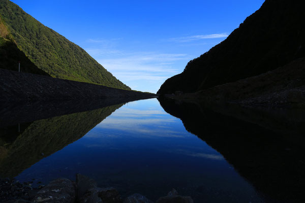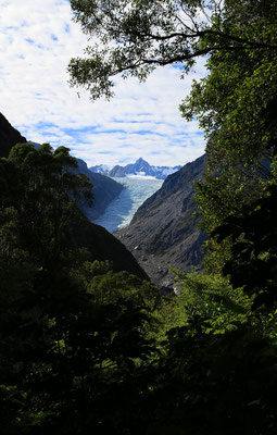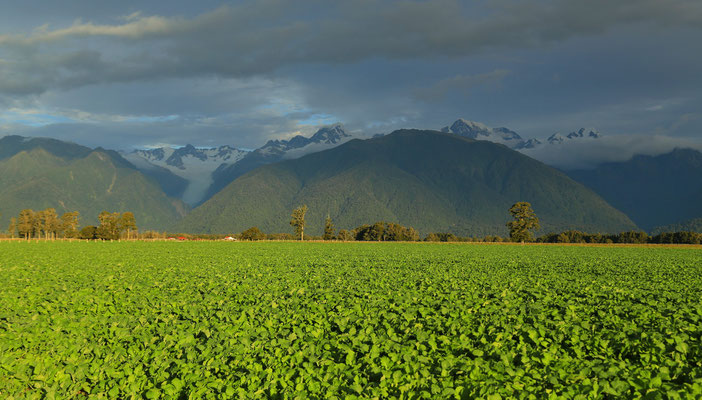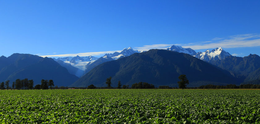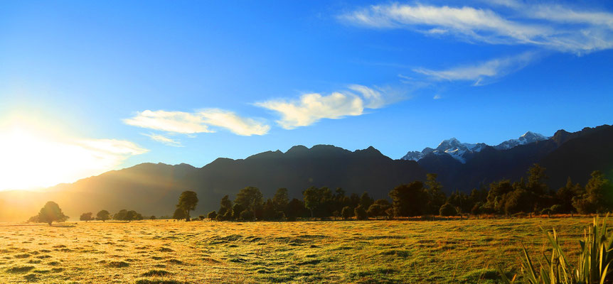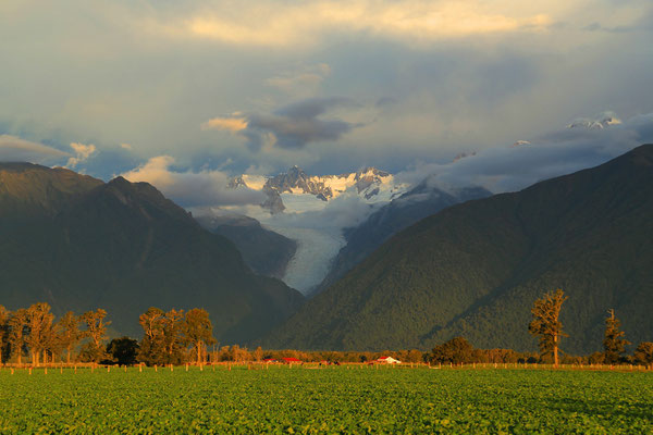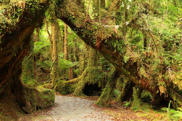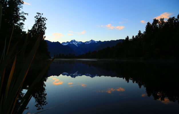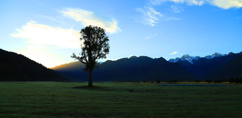 Weiter geht es zu den Gletschern. Ich entscheide mich dazu, am Fox Glacier zu verweilen und checke mich im Ivory Tower Hostel ein - nett, mein kleiner Elfenbeinturm. Da das Wetter wieder einmal genial ist, geht es raus in den Regenwald. Hier entdecke ich meine absolute Lieblingstrecke - der Minnehaha-Track. Der kleine Wanderweg geht mitten durch den wildbewachsenen Regenwald. Oh wow! Stolz bin ich, dass ich es auch hier schaffe, joggen zu gehen. Früh am nächsten Morgen stehe ich bereits um 6.00 Uhr auf. Es geht an den sechs Kilometer entfernten Matheson Lake. Vom Parkplatz aus muss man zirka noch 30 Minuten gehen, bis man den See erreicht. Ganz schön unheimlich bei Dunkelheit alleine durch den Wald zu stapfen, doch der Blick auf den See ist es allemal wert. Schön spiegelt sich der Mount Cook darin. Und dann kommen doch noch zwei andere Wanderer, die es auch geschafft haben, aufzustehen. Zurück am Parkplatz genehmige ich mir erst mal einen Kaffee, lasse mich von der Sonne wärmen und lese ein Stücken weiter in "Herr der Ringe". Könnte nicht jeder Morgen so anfangen? Dann geht es zum Fox Glacier. Nach Alaska und Patagonien empfinde ich diesen Gletscher als Miniaturausgabe. Erschreckend finde ich die Angaben, wie groß der Gletscher noch vor 200 beziehungsweise vor 100 Jahren war. Nach weiteren 100 Jahren wird es dieses Gletscher wohl nicht mehr geben. Am nächsten Tag wollte ich eigentlich am Franz-Josef-Gletscher vorbei schauen, doch das Wetter spielt nicht mir. So fahre ich weiter zu meiner nächsten Unterkunft in Punakaiki. Das Hostel liegt inmitten des Regenwaldes und heute regnet es aus Strömen. So mache ich mir eine Tasse Tee, setzte mich an den Tisch ans große Fenster, lese ein bisschen und sortiere mal wieder meine Fotos. Ui, dann kommt die Besitzerin und reicht mir einen leckeren Muffin. Das hier erinnert mich ein bisschen an das Holzhäuschen in Costa Rica, drum herum nur grün und der Regen prasselt aufs Dach. So lässt sich ein Regentag aushalten :)