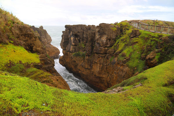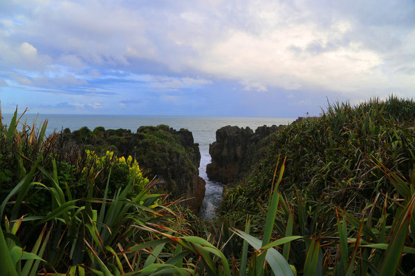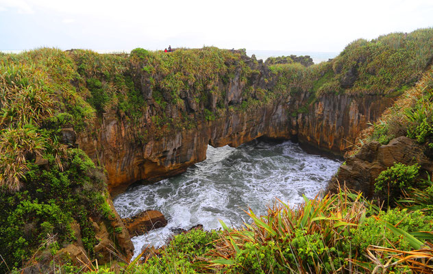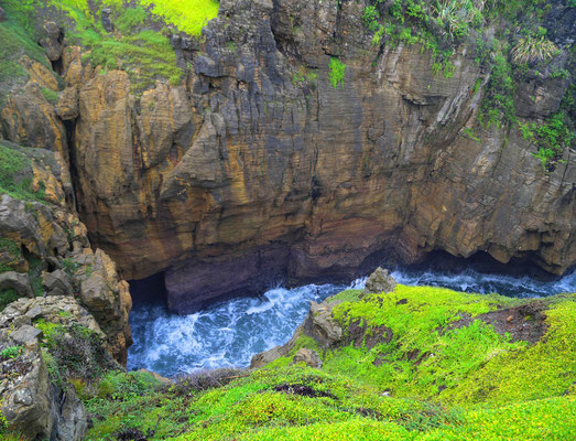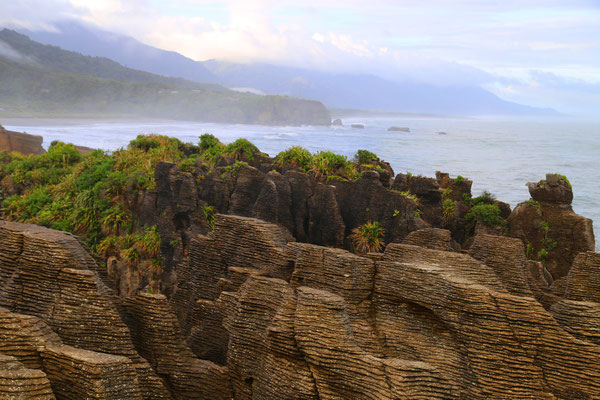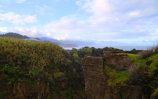 Bevor ich Punakaiki verlasse, muss ich mir unbedingt noch die Pancake-Rocks, die Pfannenkuchen-Felsen, anschauen. Hierbei handelt es sich um Felsformationen im Meer und da die "Berge"