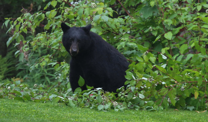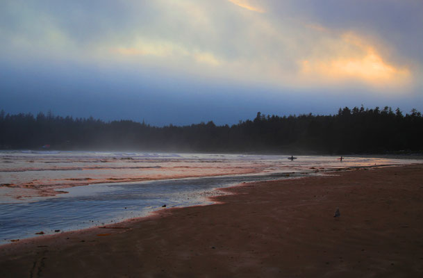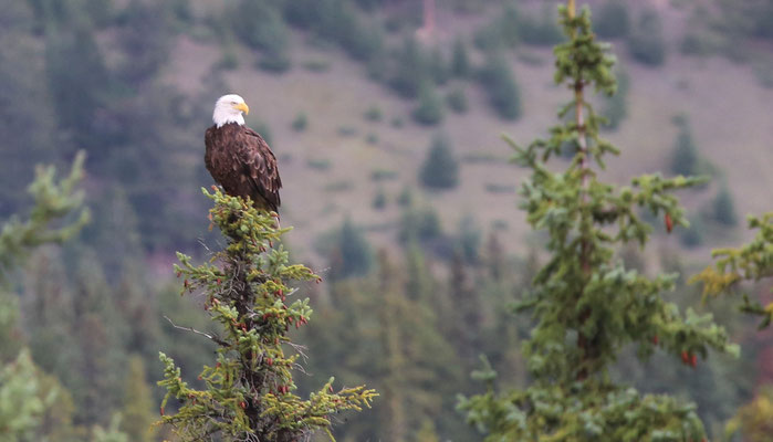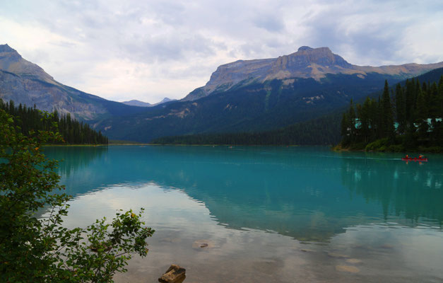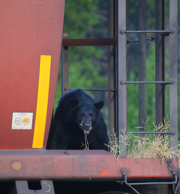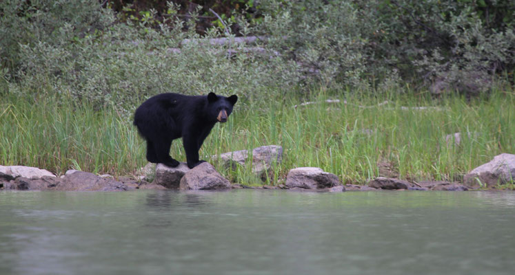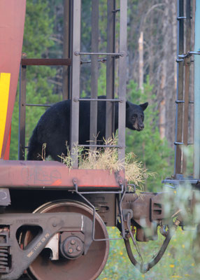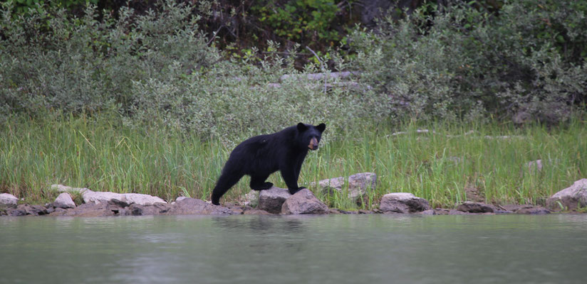 Vom Jasper-Nationalpark geht es weiter zum Wells Grey Provincial Park. Auf dem Campingplatz bei Blue River mieten wir uns ein kleines Holzhäuschen, in dem wir uns gleich wohl fühlen. Auf einem Spaziergang zu einem nahe gelegenen See stolpern wir quasi über einen Bären. Er versperrt uns den Weg, wirft sich hungrig in einen Busch und scheint nicht aggressiv zu sein. Leise holen wir unsere Fotoapparate heraus und machen ein paar Aufnahmen. Jedoch fehlt uns der Mut, einfach an ihm vorbei zu spazieren, so drehen wir kurzerhand um. Noch am selben Abend treffen wir auf einen weiteren Bären, der relaxt auf einem alten, stillgelegten Zug herumklettert. Das sich in der Gegend mehr Bären aufhalten, als wir denken, zeigt sich am nächsten Tag. Wir machen einen 4-stündigen Kanuausflug auf dem Mud-Lake. So stellt man sich Kanada mit unberührter, weitläufiger Natur vor. Ein See im Nirgendwo in voller Einsamkeit. Lange müssen wir nicht warten, da taucht ein Schwarzbär am Seeufer auf und läuft elegant neben uns her. Auf was der wohl wartet, dass wir ins Wasser fallen?