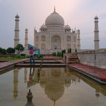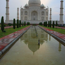 Maharadschamärchen in Agra: Der Schöpfer des Taj Mahal, Kaiser Shah Jahan, sagte, das Mausoleum seiner Frau rühre Sonne und Mond zu Tränen. Die meisten besuchen das Taj Mahal zur Sonnenuntergangszeit. Ich entscheide mich, um 4.30 Uhr los zu gehen, um bei Sonnenaufgang dort zu sein. Es hat sich gelohnt - nur wenige hatten dieselbe Idee... Gänsehaut-Feeling. Abends kann man das Taj Mahal dann vom Ufer des Fluss Yamuna betrachten.